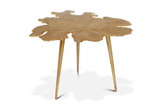A beautiful and sturdy gold side table with a natural-ish aesthetic. Well made, easy to assemble (just screw in the legs), and looks like the photos. I would have liked to see a photo with the table placed in a room, because it was a bit bigger than I thought it would be, and barely fit in the space I chose it for. Still looks great, and the advantage of it being larger is that I now have a ton of surface space for a plant, coasters, decorative objects, etc., in addition to drinks, books, and items I may use while on the couch.