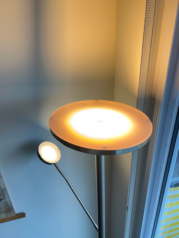 My only issue with this lamp is that it has a harsh bright white LED in both lamps. My fix was to order some professional lighting filters (think stage theater) and insert the warm filter behind the plastic lamp shade, which unscrews. Side note: the screws there are plastic which a screwdriver can easily damage. We'll see if my filter ends up melting — I am hoping the LEDs dont get too hot. With the filter fix, I'm very happy with the lamp.