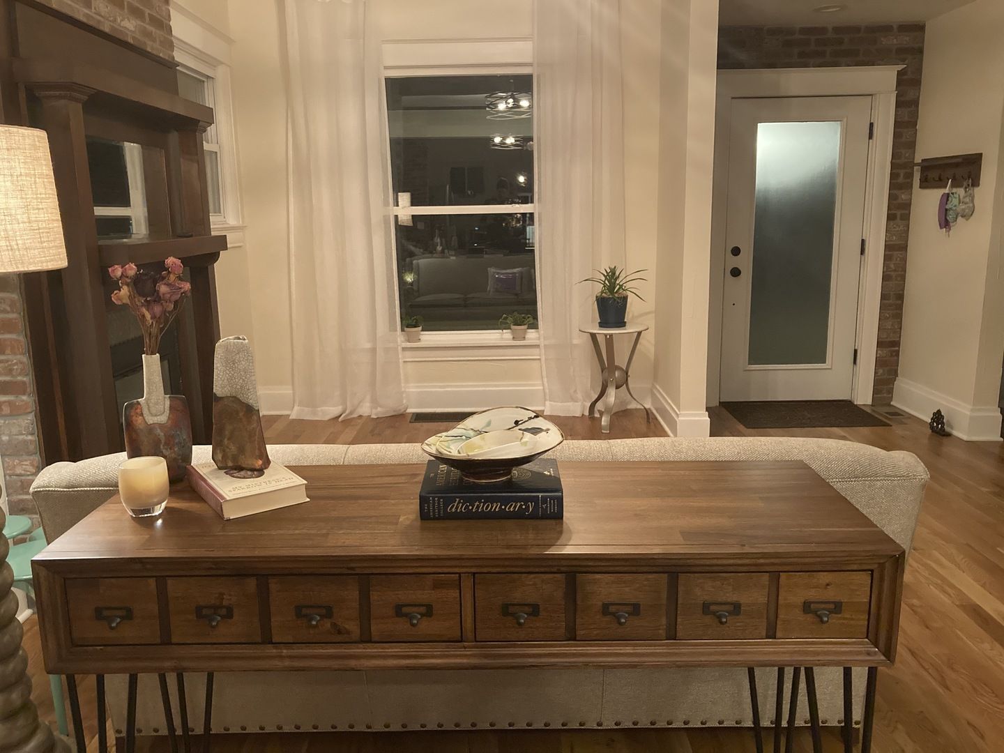 The Rollins Collection blends vintage apothecary style drawer fronts and hardware with modern hairpin legs for a beautiful updated spin on an antique classic! The Rollins Console Table features a stunning Walnut finish over acacia veneers and solid wood, beveled edge detailing and two spacious drawers!