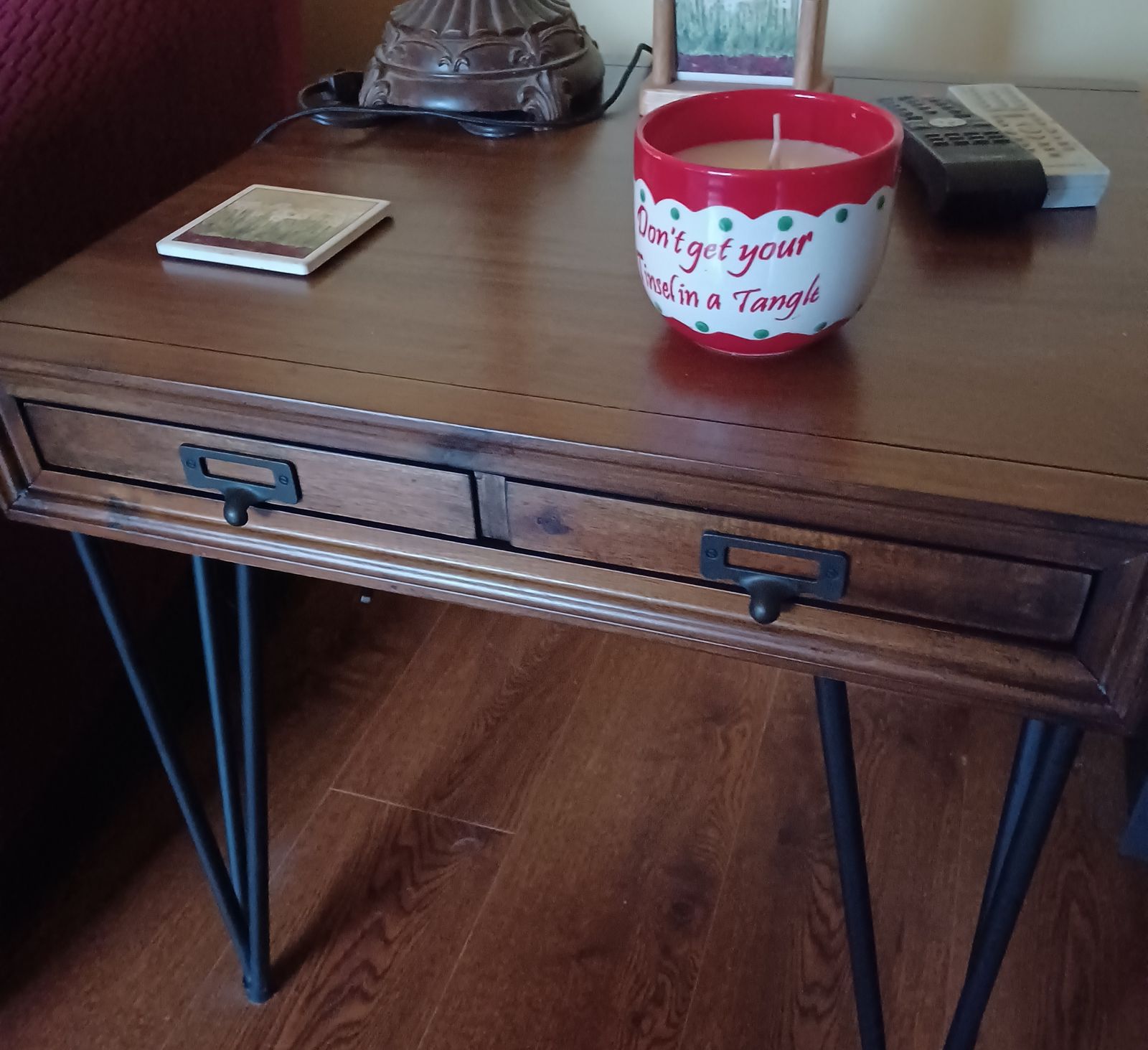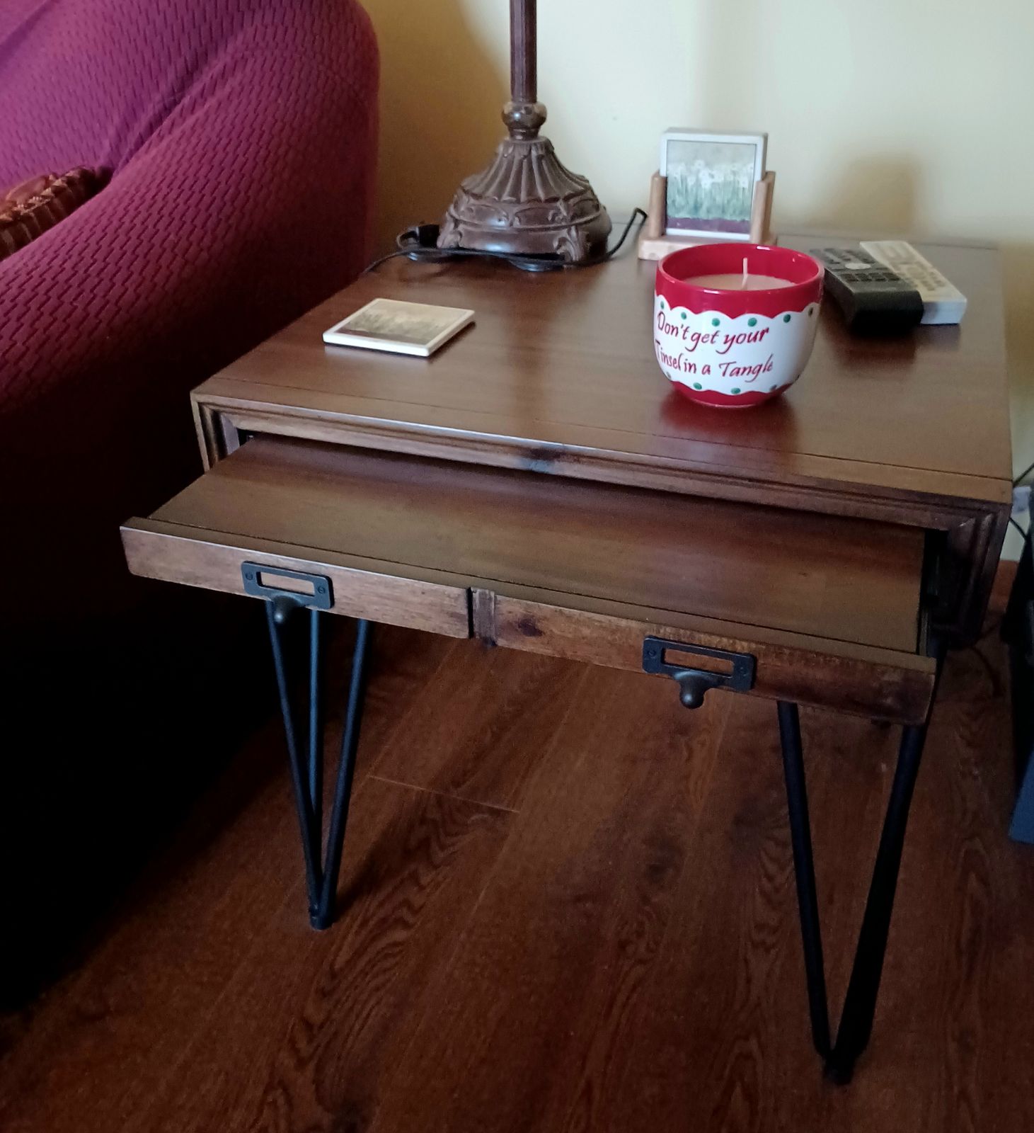 These table are well made, easy to assemble ( screw on the legs), and have adjustable feet to level. There is an actual tray(as described) that pulls out, it is not a shallow drawer. One notable difference- legs are BLACK and table is quite a bit darker and more polished/less rustic than the single item photos led me to believe. I will be keeping them anyway, as the style and quality are worth the color difference for me. I have included pictures for reference.