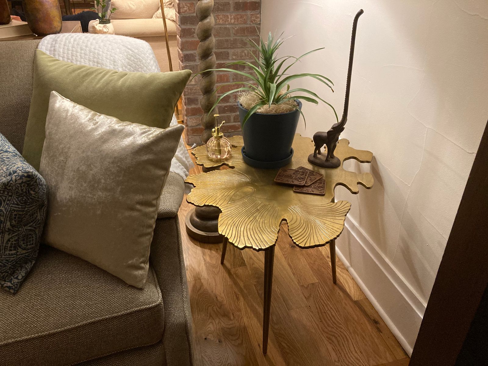 A beautiful and sturdy gold side table with a natural-ish aesthetic. Well made, easy to assemble (just screw in the legs), and looks like the photos. I would have liked to see a photo with the table placed in a room, because it was a bit bigger than I thought it would be, and barely fit in the space I chose it for. Still looks great, and the advantage of it being larger is that I now have a ton of surface space for a plant, coasters, decorative objects, etc., in addition to drinks, books, and items I may use while on the couch.