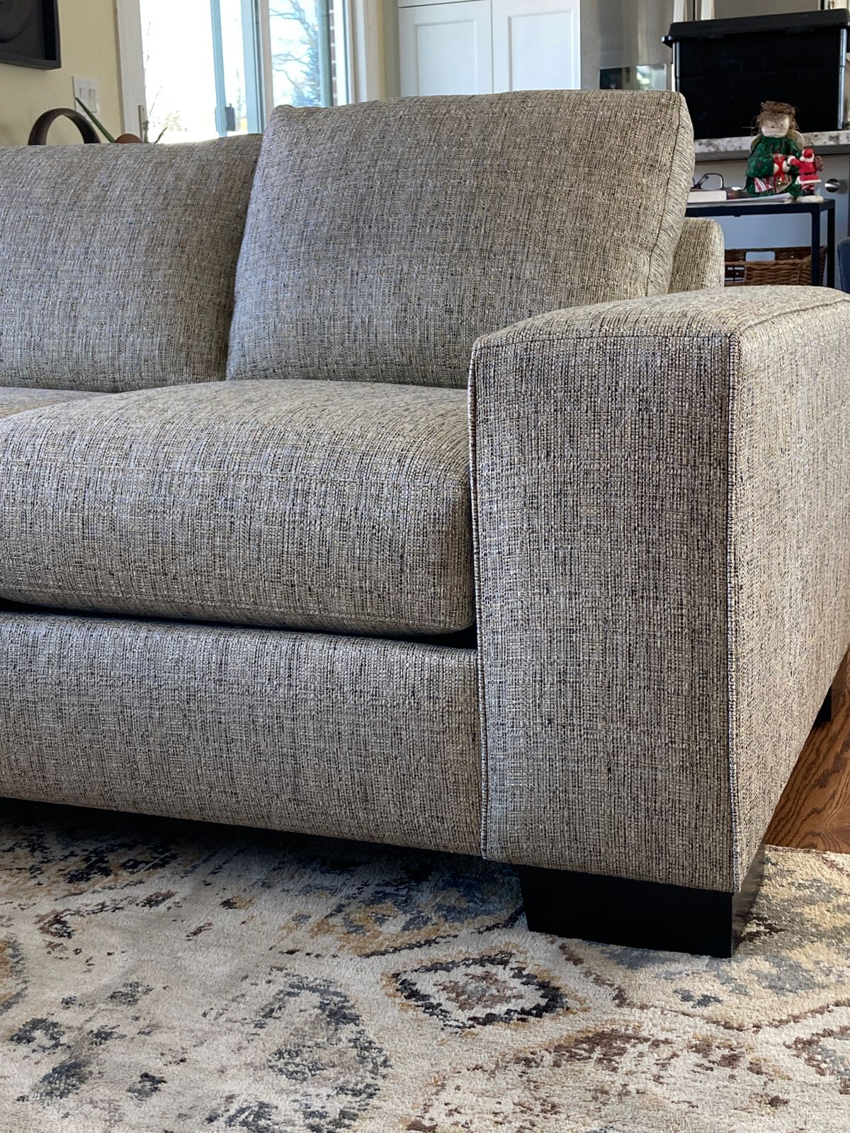 The Melrose couch has style to spare, especially once you customize it with your preferred color and leg finish. Choose from over 50 upholstery options, including a wide range of colors and various performance fabric types. Pecan, natural and espresso tones are available for the leg finish to complement your decor. This beautiful sofa with a chaise lounge is made in the USA, and the workmanship comes with a lifetime warranty.