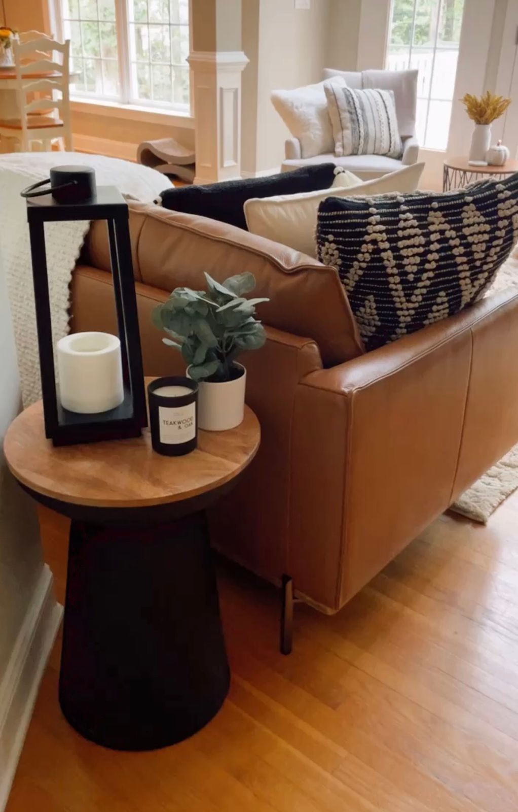 Lovely style, quality leather, beautiful caramel color. The wood base and legs are elegant.